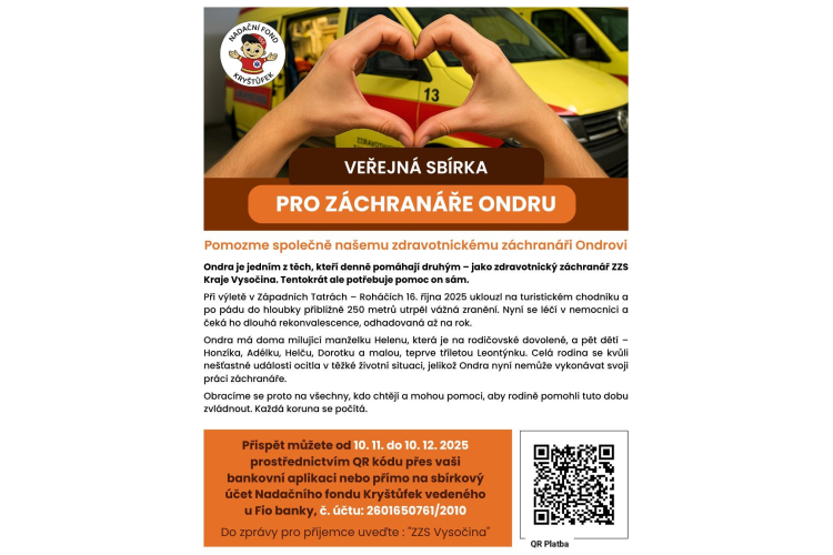 Veřejná sbírka pro záchranáře Ondru 11.11.2025 Pomozte společně zdravotnickému záchranáři Ondrovi. Ondra je jedním z těch, kteří denně pomáhají druhým - jako zdravotnický záchranář ZZS Kraje…