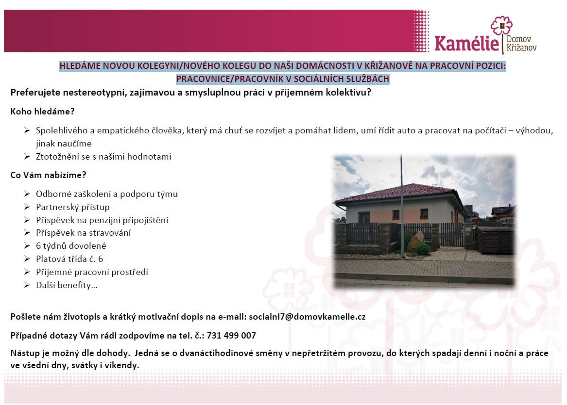 HLEDÁME NOVOU KOLEGYNI/NOVÉHO KOLEGU DO NAŠI DOMÁCNOSTI V KŘIŽANOVĚ - PRACOVNICE/PRACOVNÍK V SOCIÁLNÍCH SLUŽBÁCH