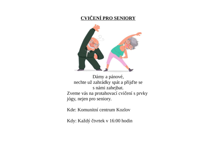 Cvičení pro seniory v Kozlově 29.10.2025 KDY: Každý čtvrtek v 16 hodin KDE: Komunitní centrum Kozlov Dámy a pánové, nechte už zahrádky spát a přijďte se s námi zahejbat. Zveme vás na…