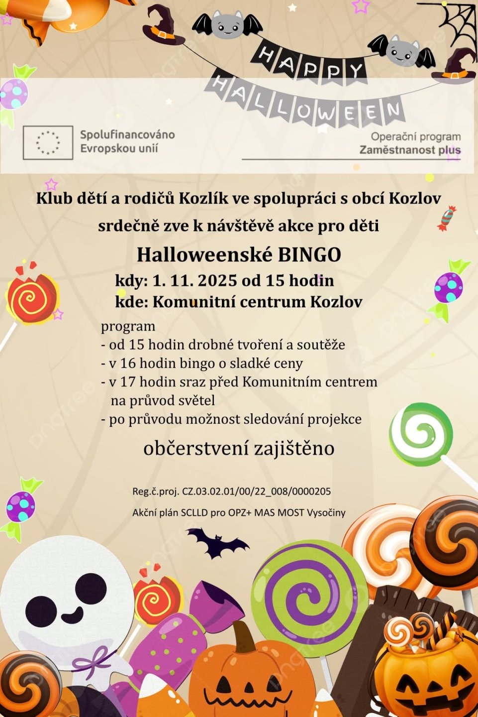Klub dětí a rodičů Kozlík ve spolupráci s obcí Kozlov srdečně zve k návštěvě akce pro děti Halloweenské bingo.